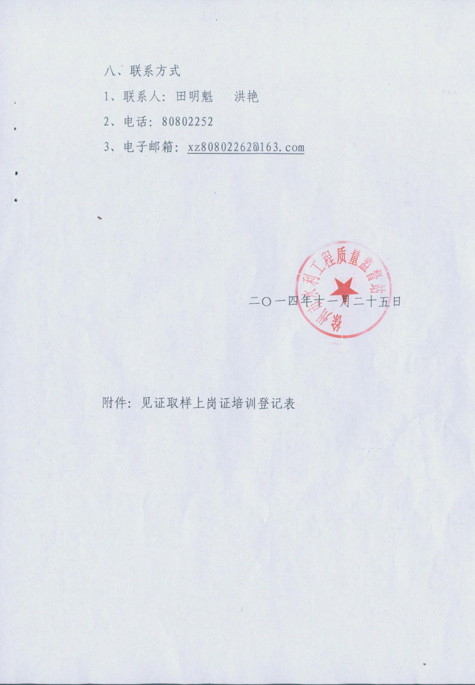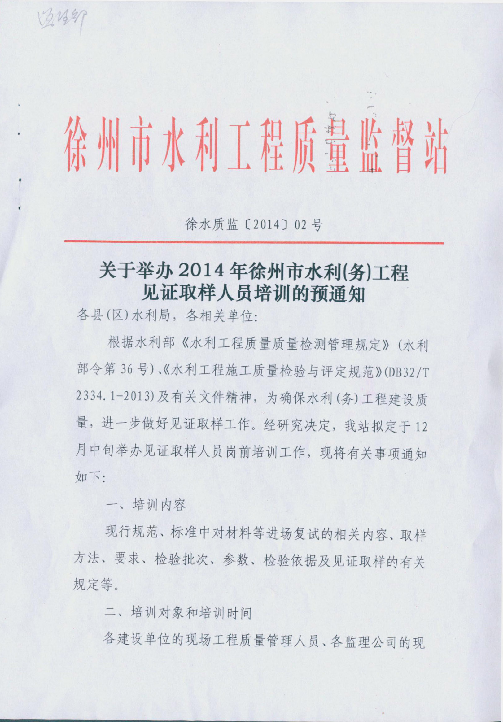 各片區(qū): 現(xiàn)將徐州市水利工程質(zhì)量監(jiān)督站《關(guān)于舉辦2014年徐州市水利(務(wù))工程見證取樣人員培訓(xùn)的預(yù)通知》轉(zhuǎn)發(fā)給大家,請各個片區(qū)至少報名一人參加培訓(xùn),于2014年12月7日前將“電子證件照片”和《見證取樣人員培訓(xùn)班登記表》報至綜合部。 附件: 1、《關(guān)于舉辦2014年徐州市水利(務(wù))工程見證取樣人員培訓(xùn)的預(yù)通知》 2014年12月2日