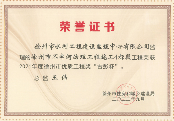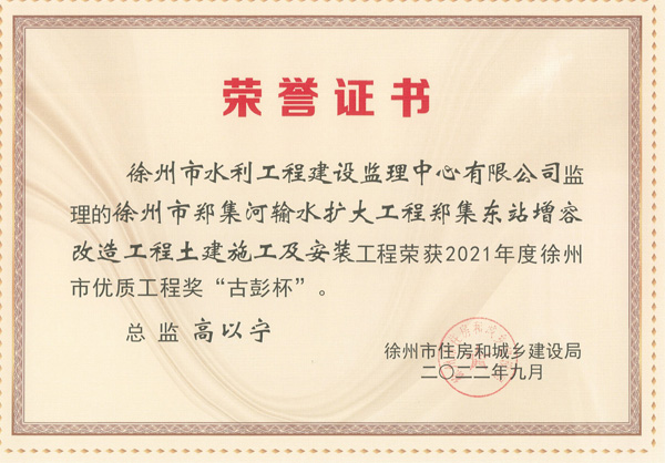 根據(jù)《徐州市優(yōu)質(zhì)工程獎“古彭杯”評選辦法》2022年9月23日,徐州市住房和城鄉(xiāng)建設(shè)局以徐住建發(fā)[2022]161號文,公布2021年度徐州市優(yōu)質(zhì)工程獎“古彭杯”和徐州市優(yōu)質(zhì)結(jié)構(gòu)工程獎獲獎情況,我單位監(jiān)理的“黃山大道污水管網(wǎng)提質(zhì)增效工程”、“2018年新沂市村莊生活污水治理EPC工程”、“豐縣村莊污水治理工程”、“徐州市不牢河治理工程施工4標(biāo)段”、“徐州市黃河故道后續(xù)工程(豐縣段)施工2標(biāo)段”、“徐州市鄭集河輸水?dāng)U大工程鄭集東站增容改造工程”6個工程獲得獎項(xiàng)。